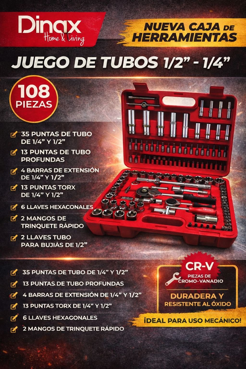 CAJA DE HERRAMIENTAS DINAX 108 PIEZAS JUEGO DE TUBOS 1/2 - 1/4" cantidad